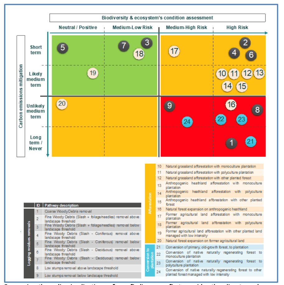 EASAC finds it highly significant that the only scenario with neutral or positive biodiversity impact that has short-term carbon impacts is burning fine woody debris from coniferous forests (typically twigs and low-diameter branches). And even then, JRC state that enough of this material should be left onsite to maintain soil carbon and fertility. The next category of carbon emission savings between 3-5 decades (with neutral or positive biodiversity impacts) is limited to “former agricultural land and afforestation with other planted land managed with low intensity”. (see Figure below from page 9 of the executive summary of the JRC Report available at https://publications.jrc.ec.europa.eu/repository/bitstream/JRC122719/jrc-forest-bioenergy-study-2021-final_online.pdf).