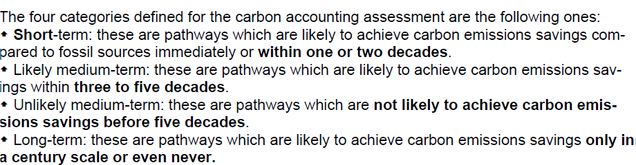 The JRC report is extremely helpful in clarifying where current bioenergy operations reside against this fundamental and common-sense performance measure. In their report, JRC classifies different sources of bioenergy feedstock according to the length of time before they “are likely to achieve carbon emission savings compared to fossil fuels” into short (1-2 decades), likely medium (3-5 decades), unlikely medium (over 5 decades) and long-term (over a century or never). Helpfully, the report describes the types of feedstocks that belong to each of these categories. Since the origin of the JRC review was to inform the EU’s Biodiversity Strategy for 2030, the report also very helpfully assesses the biodiversity risk of different feedstocks and harvesting practices.