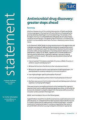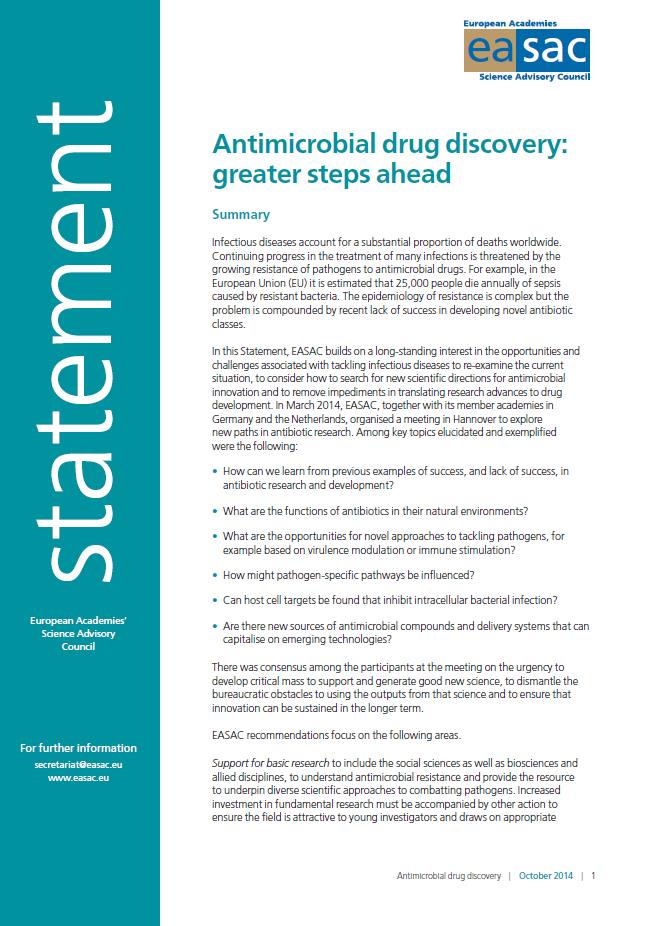 In this Statement, EASAC builds on a long-standing interest in the opportunities and challenges associated with tackling infectious diseases to re-examine the current situation, to consider how to search for new scientific directions for antimicrobial innovation and to remove impediments in translating research advances to drug development. In March 2014, EASAC, together with its member academies in Germany and the Netherlands, organised a meeting in Hannover to explore new paths in antibiotic research. Among key topics elucidated and exemplified were the following:
