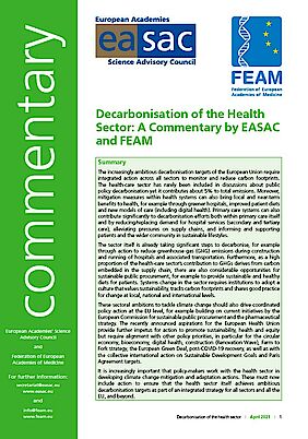 The increasingly ambitious decarbonisation targets of the European Union require integrated action across all sectors to monitor and reduce carbon footprints. The health-care sector has rarely been included in discussions about public policy decarbonisation yet it contributes about 5% to total emissions. Moreover, mitigation measures within health systems can also bring local and near-term benefits to health, for example through greener hospitals, improved patient diets and new models of care (including digital health). Primary care systems can also contribute significantly to decarbonisation efforts both within primary care itself and by reducing/replacing demand for hospital services (secondary and tertiary care), alleviating pressures on supply chains, and informing and supporting patients and the wider community in sustainable lifestyles.