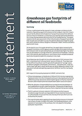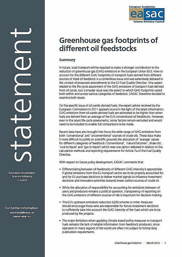 One aspect related to the life-cycle assessment of the GHG emissions of transport fuels derived from oil sands, but a broader issue was the extent to which GHG footprints varied both within and across various categories of feedstock. EASAC therefore decided to examine both issues in its latest statement.